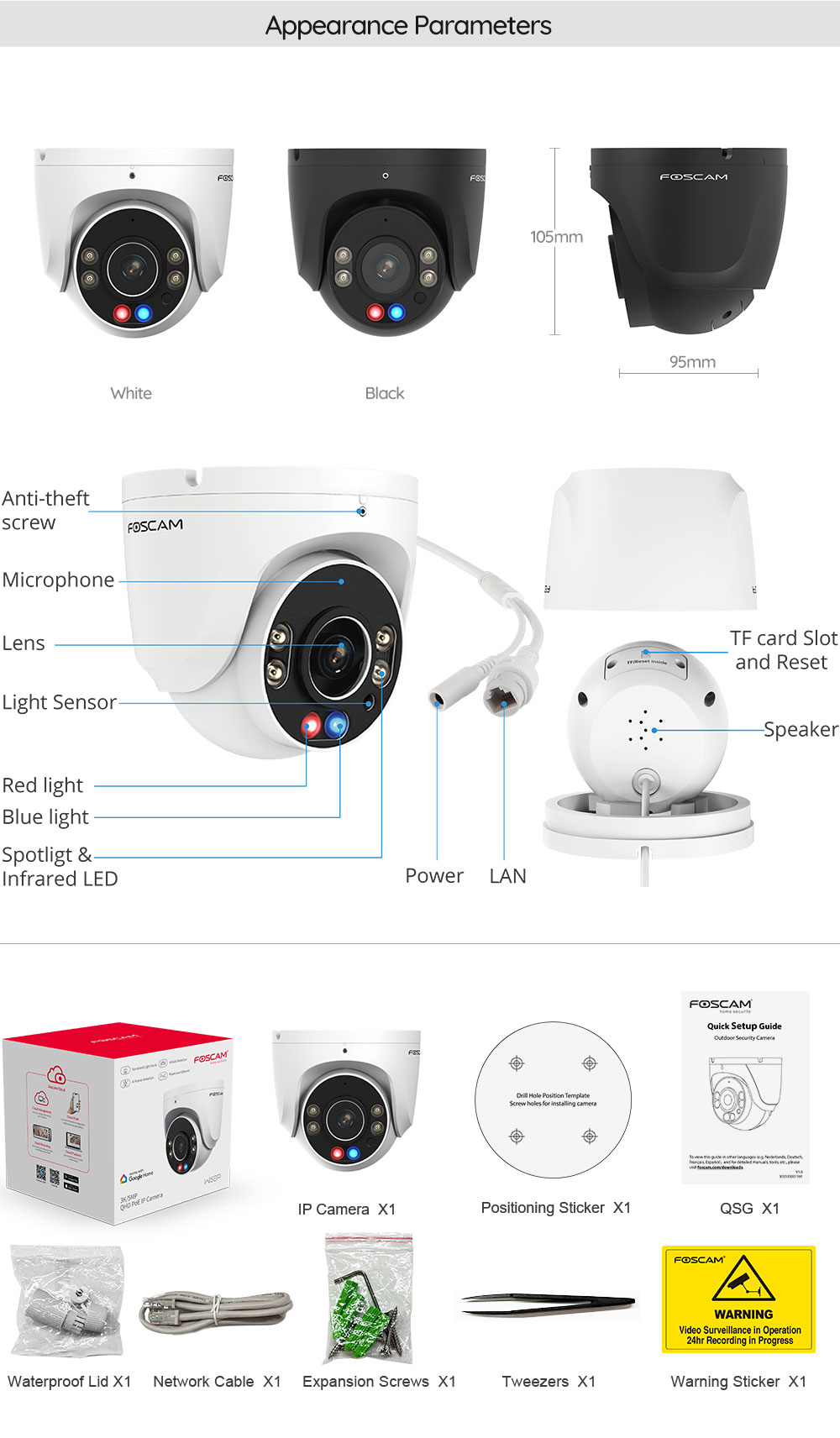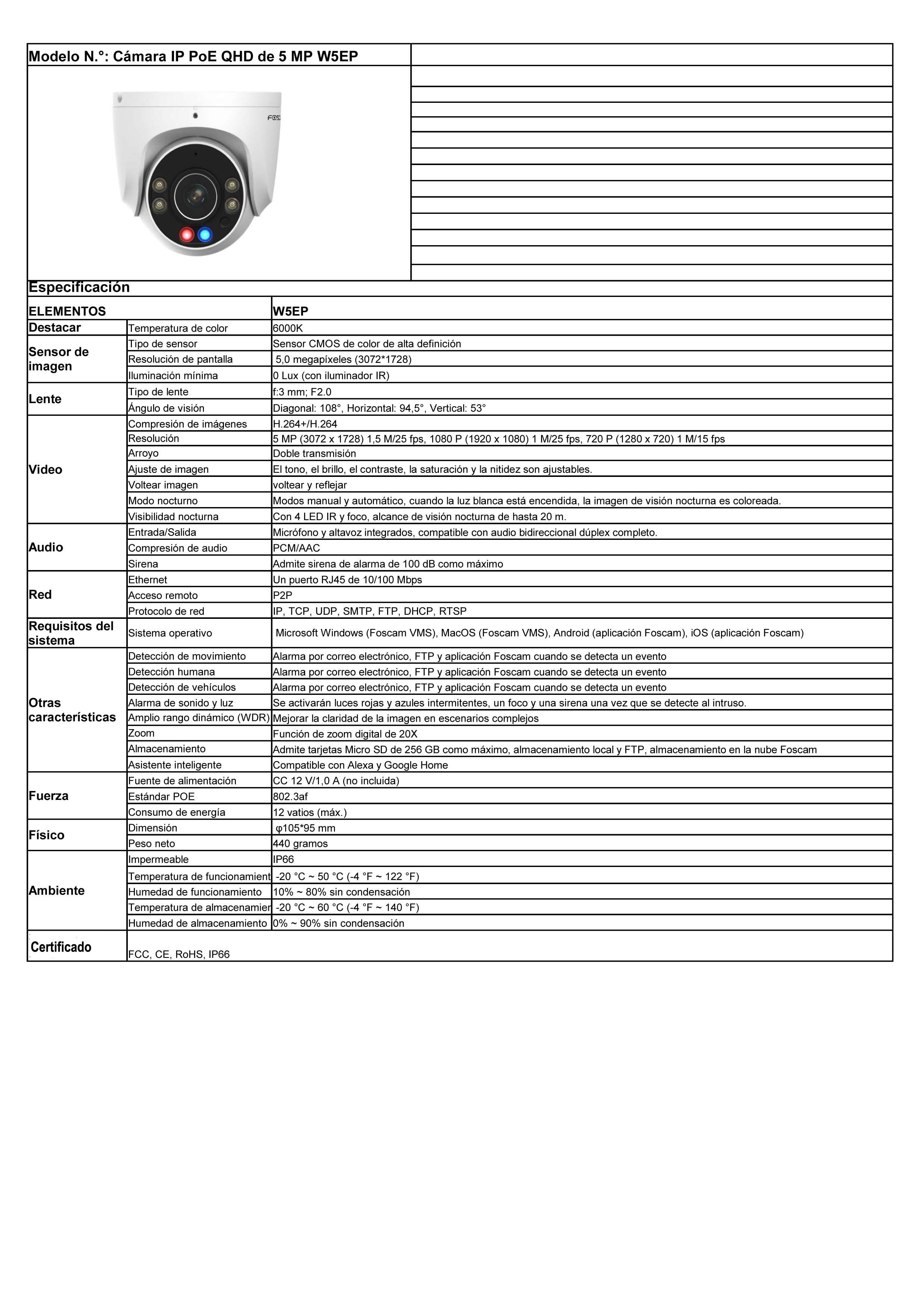 Foscam W5EP Cámara IP - PoE QHD 3K/5 MP, Exterior con iluminación de alarma roja y azul, Audio bidireccional, Blanca
